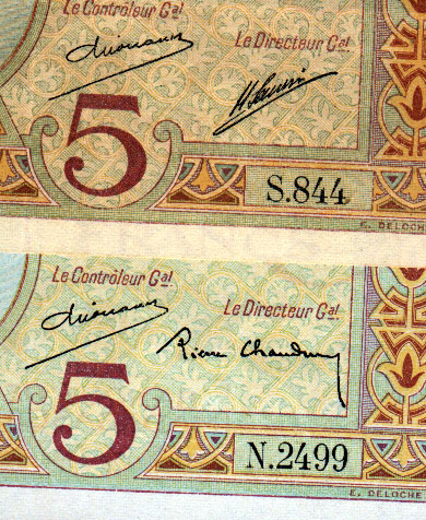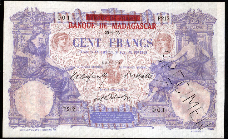 Ich möchte mit den nächsten Meldungen eine klare Linie mit Katalog Nummern und Varianten, erreichen. Die erste Banknote als provisorische Ausgabe unter Banque De Madagascar beginnt mit der Pick Nummer 34, diese Banknote gibt es als SPECIMEN und mit verschiedenen Daten. Zwei Daten gelten als gesichert 16.1.93 und 20.1.93, im Pick Katalog ist das Datum 4.1.93 in Copie abgebildet, im Text wird als Bandbreite 3.12.1892 bis 13.2.1893 genannt.Tatsächlich im Umlauf vermutlich von 1926 bis ca.1933