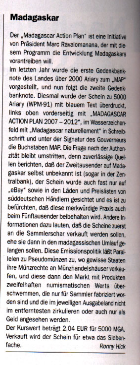 Es gibt auf dem Sammlermarkt zur Zeit eine große Verunsicherung zum Land Madagascar. Dies wurde jetzt durch einen unwahren und spekulativen Bericht im Geldscheinsammler von Ronny Hick verstärkt. Hier einige Bemerkungen und Richtigstellungen:Zur Ausgabe von Banknoten für das Land Madagascar ist einzig die Zentralbank von Madagascar berechtigt und der Gouverneur bestätigt das mit seiner Unterschrift. In Madagascar gab es einen Wechsel dieses Amtes. So wurden alle Ausgaben von 100 Ariary bis 10 000 Ariary (7 verschiedene Werte) mit der neuen Signatur ausgestattet. Diese sind wie übrigens beim Euro auch, alle noch im Umlauf und auch noch gültige Währung. Es existieren also alle Noten von 100 bis 10 000 Ariary mit zwei verschiedenen Unterschriften.Ausserdem hat das Land Madagascar auch bisher zwei Gedenkbanknoten (Madagascar Actions Plan) ausgegeben. Eine 2000 Ariary und eine 5000 Ariary Note, diese wird mit einem Aufschlag von der Zentralbank veräussert. Dieser Aufschlag wird verwendet für das Projekt - Madagascar Actions Plan - Halbierung der Armut, der Kindersterblichkeit, Verdoppelung der Bildung, Trinkwasser und Elektrizität - und das Ganze in der hälfte der Zeit also in 5 Jahren und nicht in 10 Jahren wie das Milleniumsversprechen der UN.