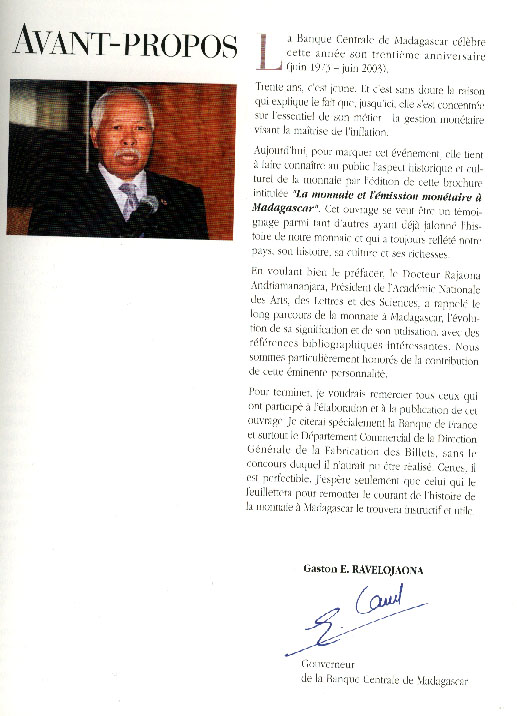 Wie bereits berichtet gibt es alle Werte von 100 Ariay bis 10 000 Ariary mit zwei verschiedenen Signaturen (derzeitiger Gouverneur Rasamoely). Bei den Scheinen 5 000 und 10 000 Ariary fehlt jetzt die Francs Bezeichnung. Durch die Währungsumstellung Januar 2004 von Francs auf Ariary fallen in Zukunft bei allen neuen Scheinen die Francs Bezeichnung weg.Der vorletzte Gouverneur heißt: Gaston E. Ravelojaona, siehe Scan.