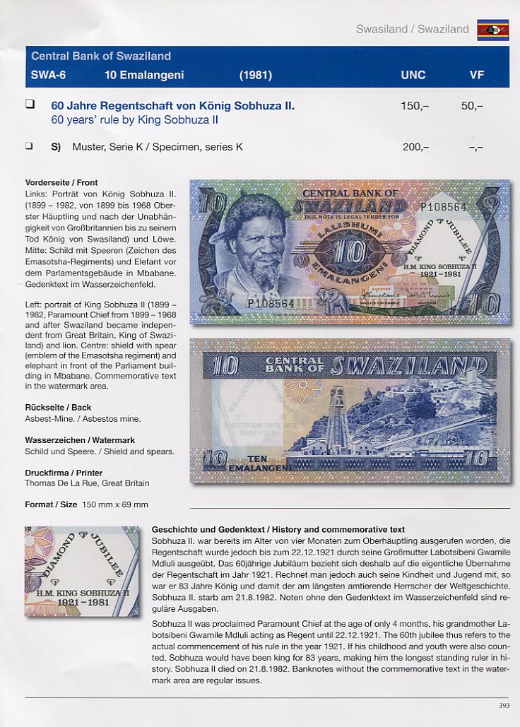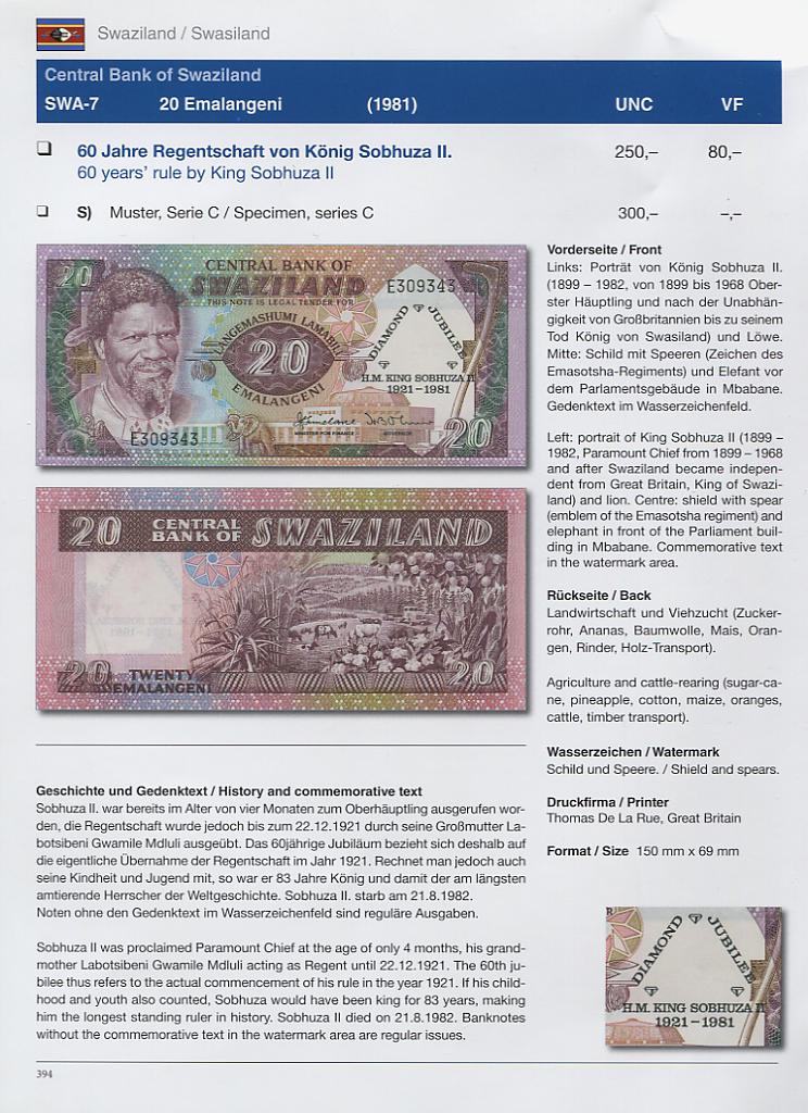 Der 50 Emalengeni Schein trägt das Datum 9. 11. 2018, der 200 Emalegeni Schein hat jetzt das Datum 6. 09. 2023. Es fehlen somit die Werte 10, 20 und 100 Emalengeni. Gedruckt wurden die Scheine von Giesecke und Devrient.