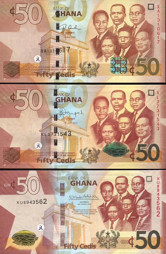 50 Cedis ab 2007 (aktuelle Währung), der größte Wert nach der Währungsreform 2007 in mehreren Variationen, aktuell 3 Pick Nummern.