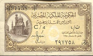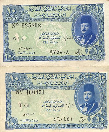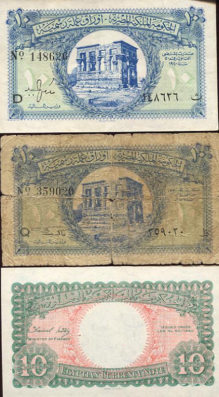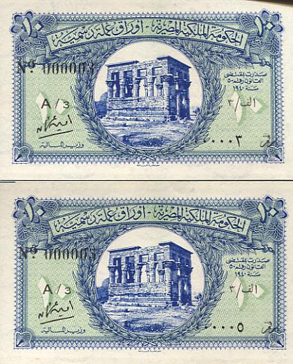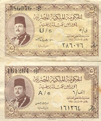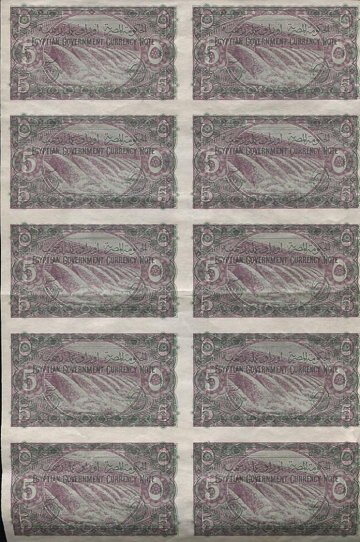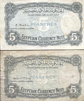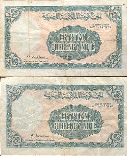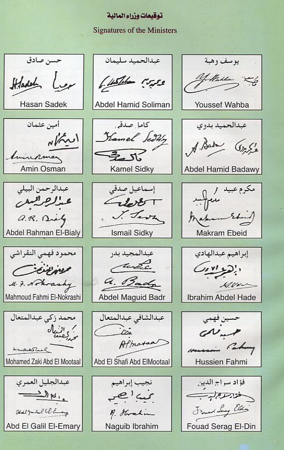 Signaturen der Finanzminister: Makram Ebeid (A05-Q05), Ismail Sidky (Q05-X05), Abdel Rahman El-Bialy (X05-B06), Ibrahim Abdel Hade (B06-D06), Abdel Maguid Badr (D06-P06), Mohamed Fahmi El-Nokrashi (P06-B07), Hussien Fahmi B07-O07), Abd El Shafi Abd El-Mootaal (O07-T07), Mohamed Zaki Abd El Mootaal (T07-F08+A09-D09) und Fouad Serag El-Din (F08-A09) - Reihe A05 bis D09 (Minister of Finace). Abd El-Shafi Abd El-Mootaal (E09-K09) Naguib Ibrahim (K09-M09) und Abd El Galil El-Emary (später Governeur) Reihe M09 bis S09+V09+W09 (Minister of Finace and Economy).