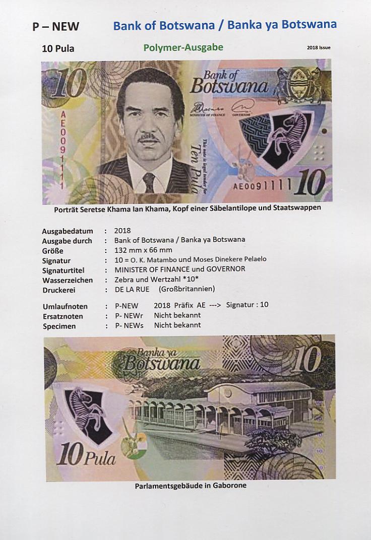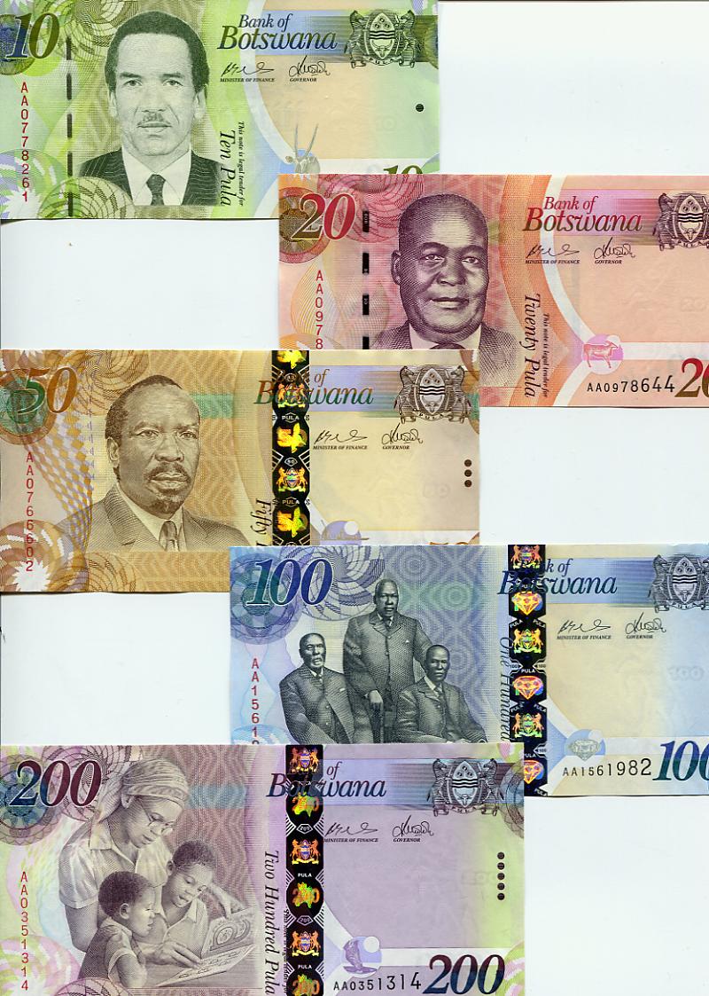 Seit August 2009 gibt es in Botswana eine komplette neue Serie an Banknoten. Von 10 Pula bis 200 Pula reicht jetzt die Serie und es gibt auch Ersatzbanknoten mit der Serienbezeichnung ZZ.