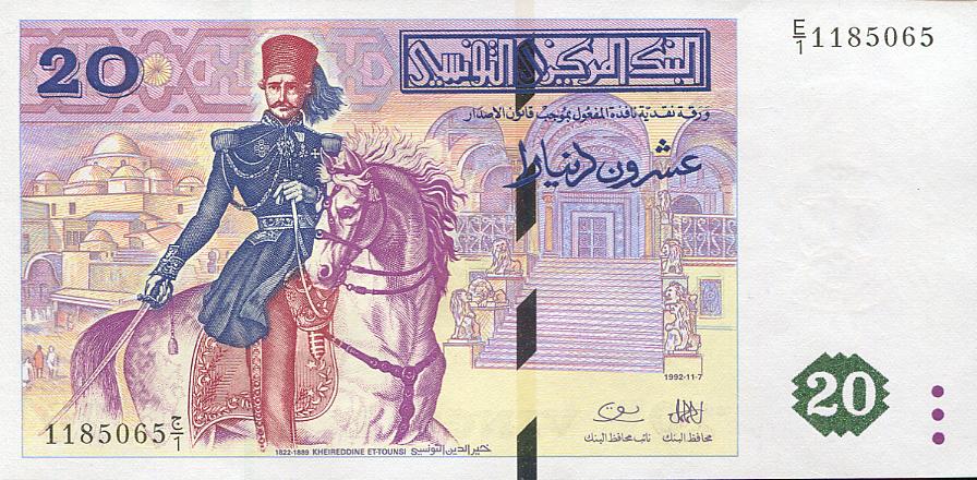 Porträt von Brigadegeneral Hayreddin Pascha zu Pferd, das auch Verwendung fand auf der 20 Dinar Banknote 1992 und 2011 (bis heute gültige Währung von Tunesien). Das Bild befindet sich im Nationalmuseum von Bardo.