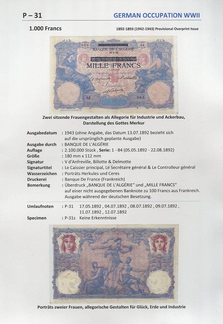 Weltkatalog Pick Nummer 31 = 100 Francs (1892) Behelfsnote 12/1942 - 05/1943 Deutsche Besetzung