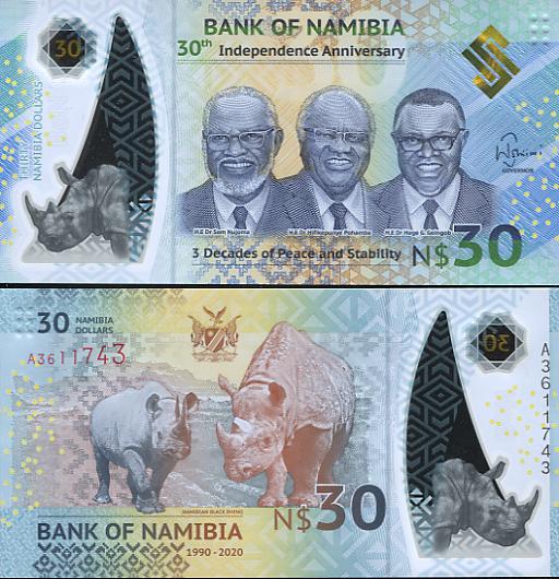 Gedenkbanknoten - Commemorative Im Januar 2025 wurde in Namibia eine 60 Namibia Dollar Gedenbanknote ausgegeben, in Polymer. Hage Gottfried Geingob (* 3. August 1941 in Otjiwarongo, Südwestafrika; † 4. Februar 2024 in Windhoek) war ein namibischer Politiker (SWAPO) und vom 21. März 2015 bis zu seinem Tod Präsident Namibias. Geingob, der dem Volk der Damara angehörte, war von März 1990 bis August 2002 der erste Premierminister des Landes und gilt als Mitbegründer des unabhängigen Namibia. Nach einer Ausbildung zum Schullehrer ging Geingob für ein Master- und Promotionsstudium der Politikwissenschaften in die Vereinigten Staaten. Geingob war von 1963 bis 1964 ein Repräsentant der neu gegründeten SWAPO im namibischen Nachbarland Botswana und 1964 bis 1971 bei den Vereinten Nationen in New York. Ab 1969 war er Mitglied des Zentralkomitees und des Politbüros der SWAPO. 1975 war er Gründungsmitglied des in Lusaka entstandenen United Nations Institute for Namibia, von 1975 bis 1989 war er dessen Direktor. Geingob kehrte 1989 als Leiter des SWAPO-Wahlkampfteams nach Namibia zurück und hatte als Vorsitzender der Verfassungsgebenden Versammlung maßgeblichen Einfluss auf die Gestaltung der Verfassung Namibias. Geingobs Amtszeit als Premierminister war gekennzeichnet von einer Entwicklung einer Politik der demokratischen Glaubwürdigkeit und der erfolgreichen Einführung des neu gegründeten öffentlichen Dienstes in Namibia, zusammen mit Ministerien und anderen Regierungsbehörden. 2004 schloss Geingob seine Doktorarbeit ab und erhielt einen PhD der University of Leeds. Geingob war seit dem 29. November 2007 Vize-Präsident der SWAPO und war von 2008 bis 2012 Handels- und Industrieminister Namibias, ehe er am 4. Dezember 2012 im Zuge einer umfassenden Regierungsumbildung erneut Premierminister wurde. Bei der Präsidentschaftswahl am 28. November 2014 wurde Geingob mit 86,73 Prozent der Stimmen zum dritten Präsidenten Namibias gewählt. Es war das höchste Wahlergebnis in der Geschichte der namibischen Präsidentschaftswahlen. Am 21. März 2015 wurde Geingob vereidigt. Bei der Präsidentschaftswahl am 27. November 2019 erhielt er 56,3 Prozent der Stimmen, das bis dato schlechteste Wahlergebnis einer Präsidentschaftswahl, und war damit für eine zweite Amtszeit gewählt. Zuletzt litt sein Ansehen in der Öffentlichkeit. Die erhofften Fortschritte beim Kampf gegen Arbeitslosigkeit und Wirtschaftskrise blieben aus. Ihm wurden mögliche Verwicklungen in einen Korruptionsfall rund um die Vergabe von Fischereirechten an ein isländisches Unternehmen vorgeworfen .[ Geingob blieb trotz seiner Krebserkrankung bis zu seinem Tod Präsident. Geingob war seit dem 14. Februar 2015 in dritter Ehe mit der 35 Jahre jüngeren Unternehmerin Monica Geingos (geborene Kalondo) verheiratet. Geingob hatte fünf Kinder. Anfang 2024 gab er eine Krebserkrankung bekannt, an deren Folgen er am 4. Februar desselben Jahres verstarb. Er wurde nach einer öffentlichen Trauerfeier am 24. Februar 2024, am 25. Februar 2024 auf dem Heldenacker in Windhoek in einem Präsidenten-Mausoleum beigesetzt. Den Feierlichkeiten wohnten 18 Staatsoberhäupter bei, darunter der deutsche Bundespräsident Frank-Walter Steinmeier. Am 16. Februar 2024 wurde Geingob der Heldenstatus verliehen. Der Heldenstatus (englisch hero) ist eine staatliche Auszeichnung Namibias. Dieser wird – fast immer – posthum verliehen und kann nur durch den Staatspräsidenten ausgesprochen werden. Namibische Helden haben Anrecht auf ein Staatsbegräbnis auf dem Heldenacker bei Windhoek. Ihnen zu Ehren wurde der Heldentag, stets am 26. August, als offizieller Feiertag in Namibia deklariert. Die Ehre als Held kommt solchen Namibiern zuteil, die sich um die Freiheit des Landes, vor allem im Rahmen des namibischen Unabhängigkeitskampfs verdient gemacht haben. Der National Honours Act, 2012 definiert einen Helden oder eine Heldin als „eine Person die eine heldenhafte Handlung im Interesse der Öffentlichkeit oder einen außerordentlichen Beitrag für Namibia geleistet hat und vom Präsidenten diese Ehre verliehen bekommt.“. Als Heldentat wird „eine außerordentliche Handlung oder die Demonstration von besonderer Tapferkeit zum Wohle des namibischen Volkes“ definiert.