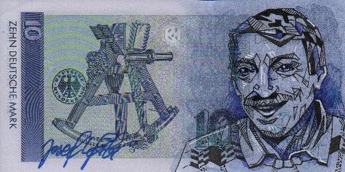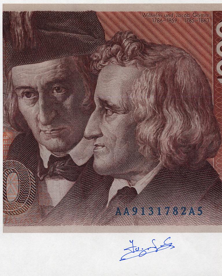Nachdem der Gestaltungswettbewerb beendet war und Reinhold Gerstetter mit seinem nachgeschobenen Entwurf siegte ging es an die Umsetzung und Fertigstellung der einzelnen Werte. Da möchte ich einen besonderen Stecher hervorheben Jose Lopez, er war verantwortlich für 3 Werte und deren Portraits. 20 DM Schein mit Annette von Droste-Hülshoff, 100 DM Schein mit Clara Schumann und den 1000 DM Schein mit den Gebrüdern Grimm. Handsignatur von Jose Lopez, auch ein kleines Kunstwerk.