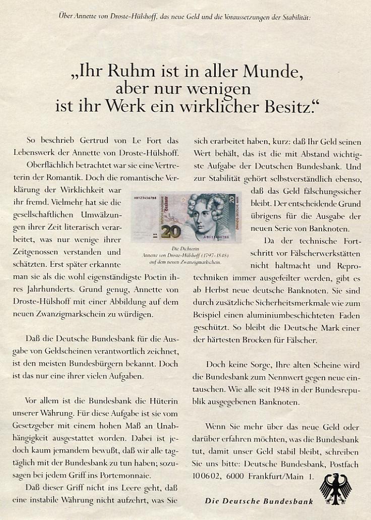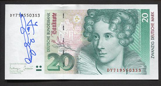 20 DM Schein Droste-Hülshoff mit Handsignatur Jose Lopez.