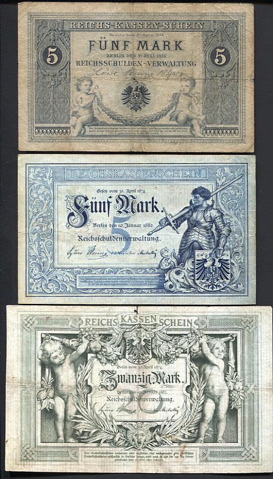 Die ersten beiden Ausgaben der 5 Mark Scheine und der 20 Mark Schein.