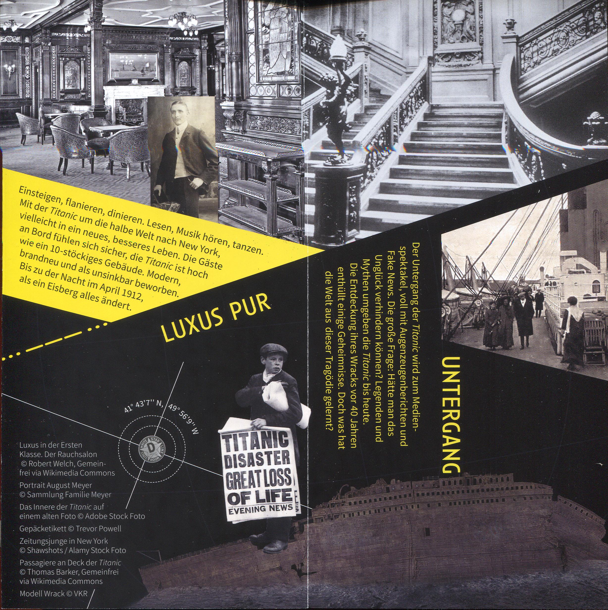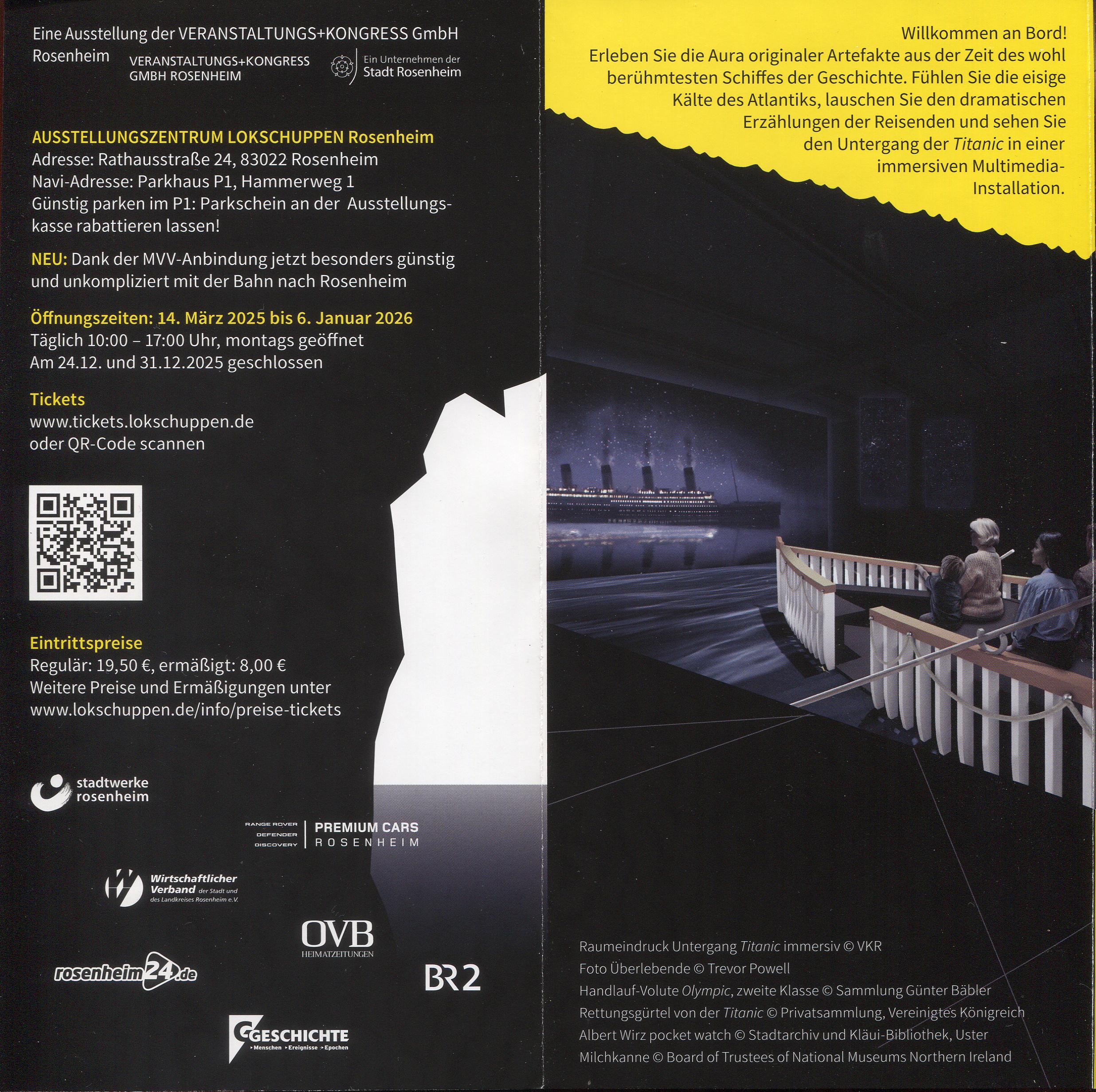 Die neue Ausstellung "TITANIC" im Lokschuppen in Rosenheim, gilt als die perfektesste Ausstellung ihrer Art. Die Anspruchsvolle Zeit neuer Entwicklungen: Größer, Schneller und Luxeriös stellen neue Maßstäbe. Die Zeit von 1908 bis 1912 war auch für die deutsche Währung von entscheidender Bedeutung. Die Kaiserzeit, so nannte man die Zeitepoche Deutschlands von 1871 bis 1914. Das Geld Deutschlands war zu dieser Zeit noch voll mit Gold gedeckt. Die ersten deutschen Banknoten 5, 20, 50(1874) 100 und 1000 Mark(1876). Die RMS Titanic war ein britischer Passagierdampfer der White Star Line und bei ihrer Indienststellung am 2. April 1912 das größte Schiff der Welt. Sie wurde für den Einsatz im Transatlantik-Liniendienst zwischen Southampton und New York entworfen und startete am 10. April 1912 zu ihrer Jungfernfahrt. In der Nacht vom 14. auf den 15. April 1912 stieß sie im Nordatlantik mit einem Eisberg zusammen. Aufgrund der dabei entstandenen Schäden versank sie zwei Stunden und vierzig Minuten später. Von den über 2220 an Bord befindlichen Menschen kamen 1514 Personen ums Leben, weshalb der Untergang zu den größten Unglücken der Seefahrt zählt. Das katastrophale Ende der ersten Fahrt der Titanic fand enormen Widerhall in den Medien und prägt bis heute die Vorstellungen über Schiffsunglücke. Dazu beigetragen haben die Umstände des Unglücks, darauf beruhende Streitfragen und Verschwörungserzählungen und nicht zuletzt die Prominenz mancher Opfer. Eine Rolle spielt dabei der Begriff der „Unsinkbarkeit“, der damals wie heute mit der Titanic in Verbindung gebracht wird. In den offiziellen Untersuchungen und Gerichtsverfahren kam es zu keiner eindeutigen Klärung der Schuldfrage. Es wurde festgestellt, dass auf der Titanic die damaligen Sicherheitsstandards und seemännischen Praktiken im Wesentlichen eingehalten worden waren. In der Folge kam es daher zu einem Umdenken in wichtigen Fragen zur Sicherheit auf See. Noch heute ist das Interesse in Medien und Kunst an der Titanic sehr groß. Es bezieht sich häufig auf das Verhalten einzelner historischer Personen, die damalige, streng nach Klassen unterteilte Gesellschaft, auf den Luxus der Ersten Klasse sowie die technischen Aspekte des Schiffes und die Erforschung des Wracks. Bedeutsam ist ferner der Gedanke, dass technische Errungenschaften die Natur nicht bezwingen können, was sich in der Geschichte der Titanic idealtypisch zeige. Bereits im Unglücksjahr 1912 entstanden mehrere Filme über die Titanic. Überragende Bedeutung erlangte vor allem James Camerons Film von 1997, der zu einer der erfolgreichsten Produktionen der Filmgeschichte wurde. Das Unglück wird in zahlreichen Romanen und in einer großen Sachbuchliteratur verarbeitet. Außerdem gibt es Museen und Gedenkorte. Dazu zählt jetzt vom 14. März 2025 bis 6. Januar 2026 auch Rosenheim mit seinem Lokschuppen. Im Jahr 1985 wurde das Wrack der Titanic entdeckt, was das Interesse an ihr neu entfacht hat. Seitdem wurde das Wrack von Unterseebooten aufgesucht, Teile des Schiffes und andere Fundstücke wurden geborgen. Es gab auch Kritik daran, wie mit dem Unglück und den Überresten teilweise sensationslüstern und profitorientiert umgegangen wurde. Im Juni 2023 verunglückten fünf Menschen tödlich, die das Wrack im Mini-U-Boot Titan besichtigen wollten.