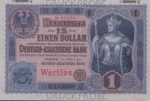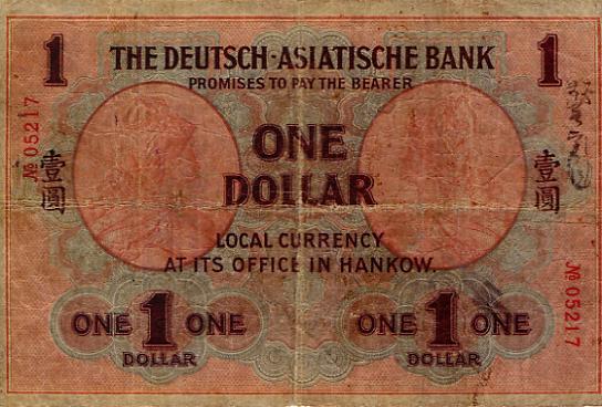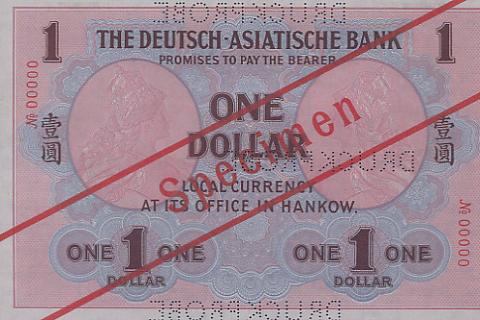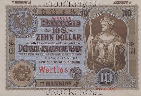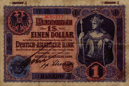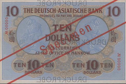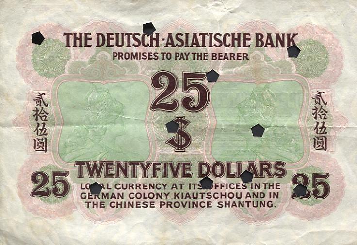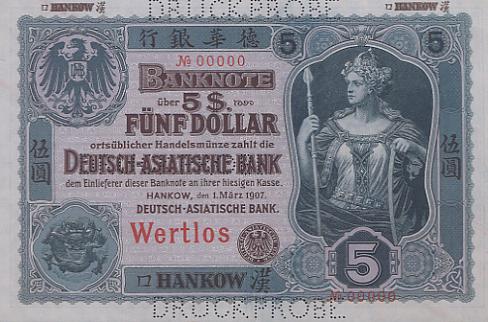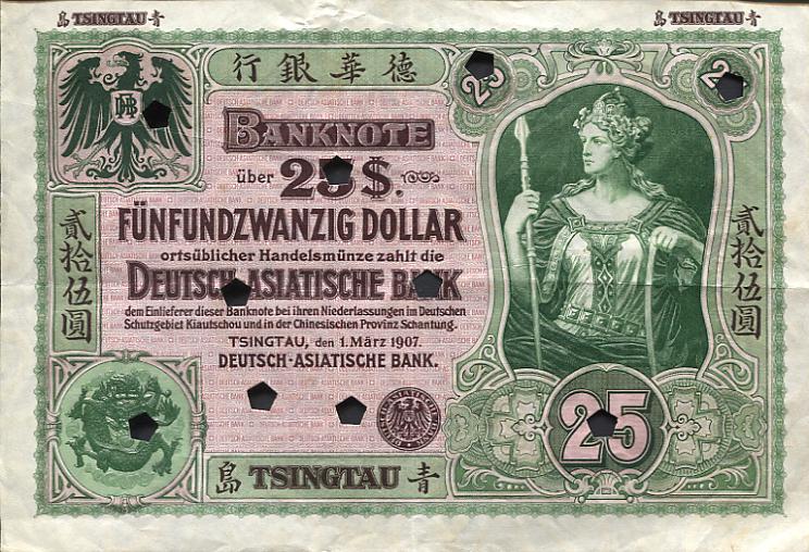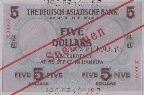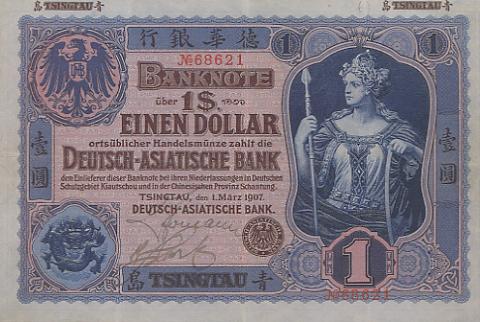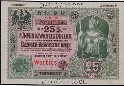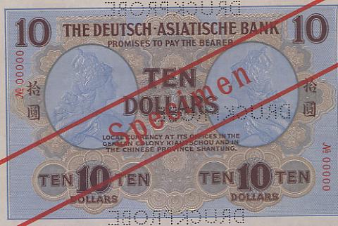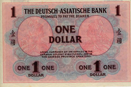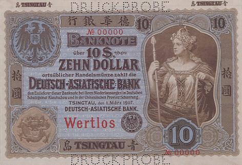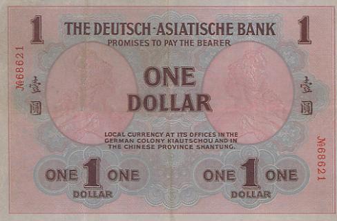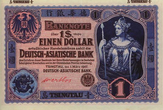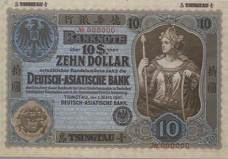 Es gab eigene Währungsausgaben 1907 und 1914 Deutsch -Asiatische Bank unter Deutscher Verwaltung.