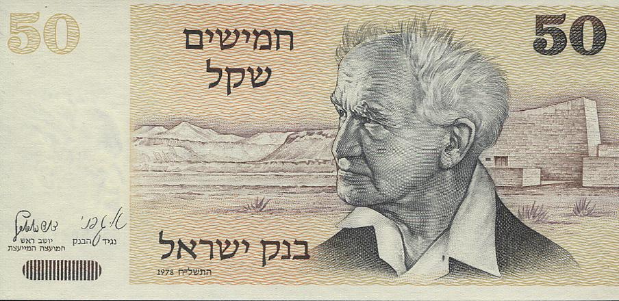 50 Shekel Note aus dem Jahre 1978 mit David Ben Gurion Gründer des Staates Israel 1948 vor dem Kibbuz Sde Boker.