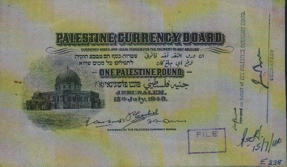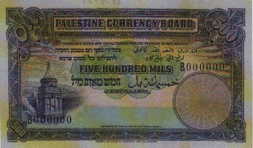 Am 15. Juni 1926 wurde das "Palestine Currency Board" gebildet. Erste Banknotenausgabe 500 Mils bis 100 Pounds tragen das Datum 1.September 1927 Ausgabedatum war 1.November 1927.