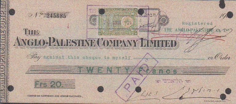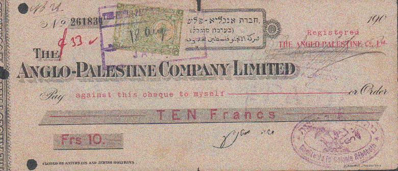 Bis 1915 gab es Anglo-Palestine Cheque Curreny ausgestellt von The Anglo-Palestine Company Limited in Francs.