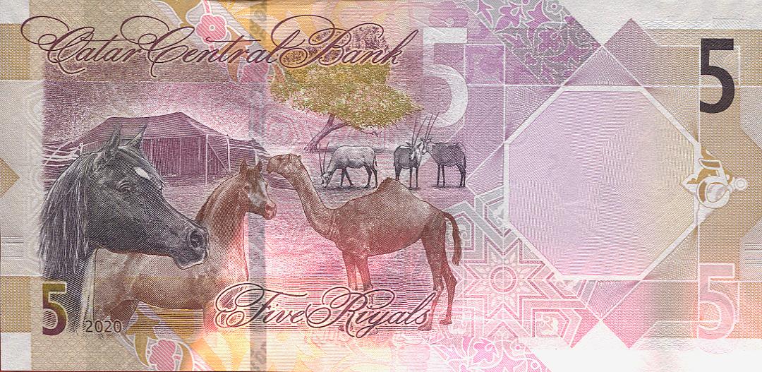 Rückseite: Tierwelt von Katar, Kamele, Pferde und Gazellen.