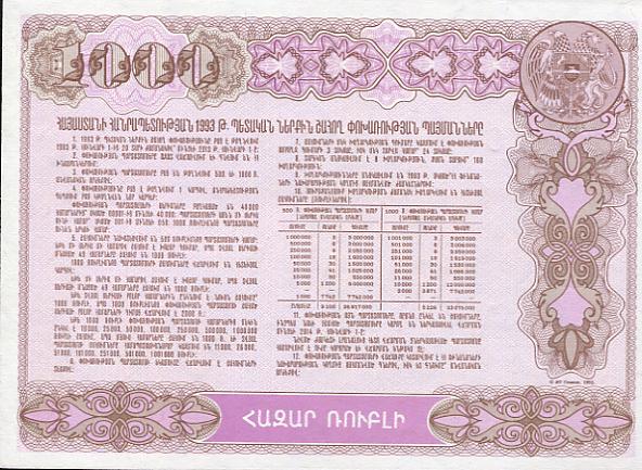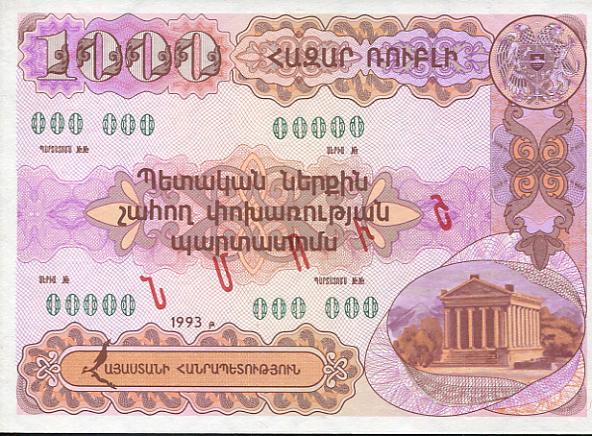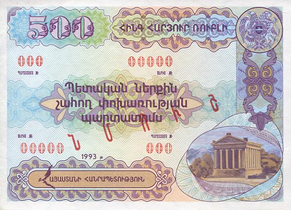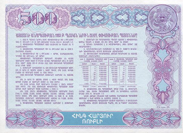 Weltkatalog Nummer 32 A, als 500 Dram 1993 Bond Coupon, damit die erste Banknote für das eigenständige Armenien.