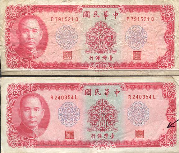 10 Yuan 1969 Unterscheidung der a und b Note, rechts unten zusätzliches A