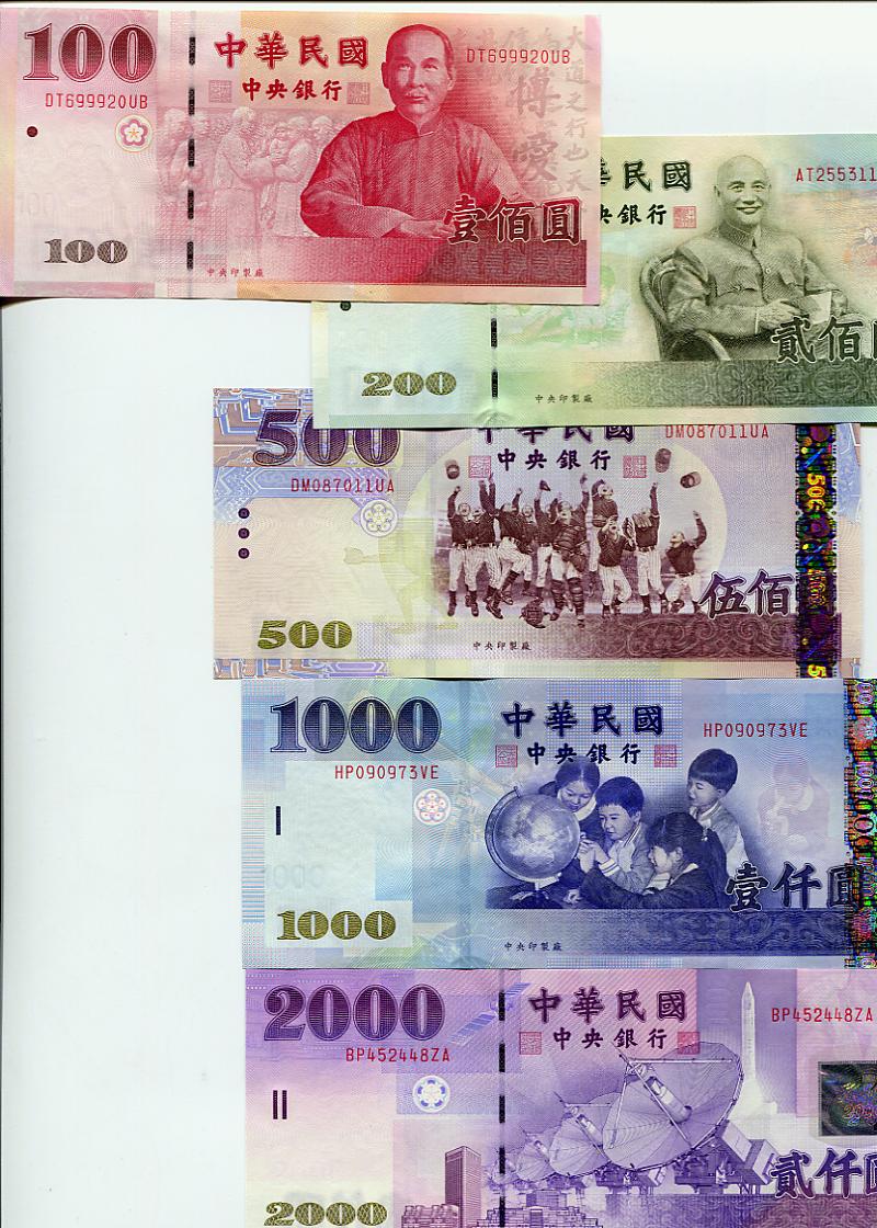 Zur Zeit gültige Währung in Taiwan. Es gibt ausserdem zwei Gedenkbanknoten und 1 Polymer Banknote.
