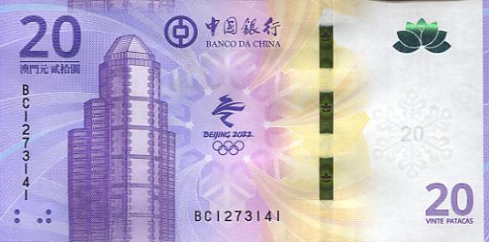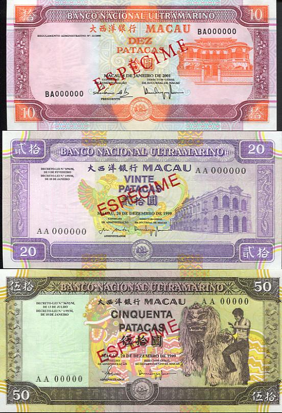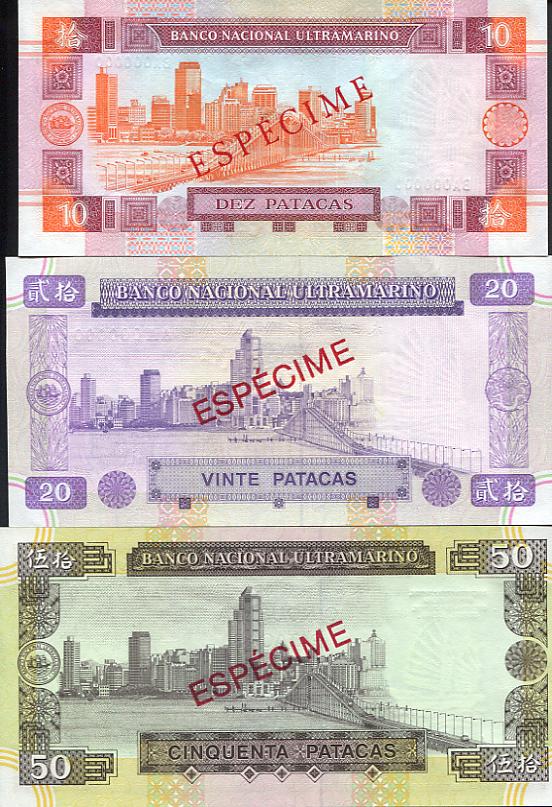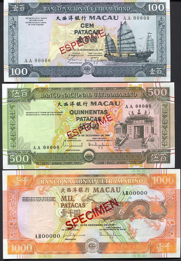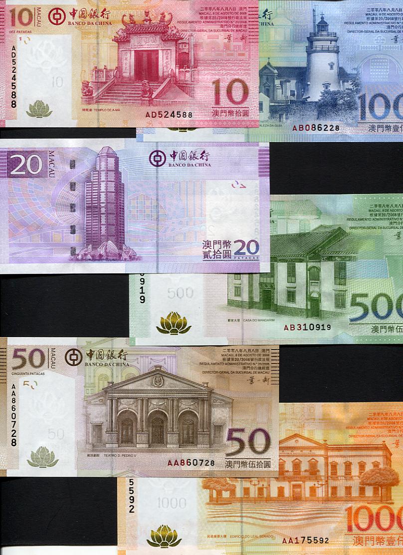 Die Währungsbezeichnung ist Patacas = 100 Avos - 6 Werte von 10 bis 1000 Patacas