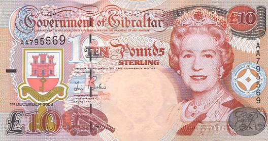 Neue Ausgabe der 10 Pounds Umlaufnote mit neuer Rückseite Casemates Square, der bekannteste Platz in Gibraltar,