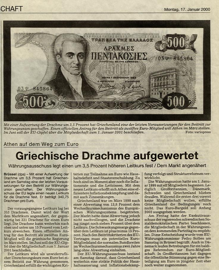 Griechenland macht eine schwere Krise durch. War der Euro ein Segen oder entpuppt er sich als Fluch. Das Land hat keine Möglichkeit über die Währung einzugreifen. Anderseits ist es vielleicht ganz gut, dass endlich der Haushalt saniert wird und die Kuroption im Lande bekämpft wird.Ich habe einen Zeitungsausschnitt aus dem Jahre 2000, siehe Scan.