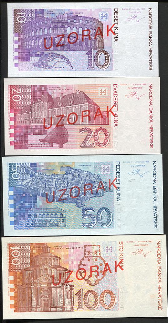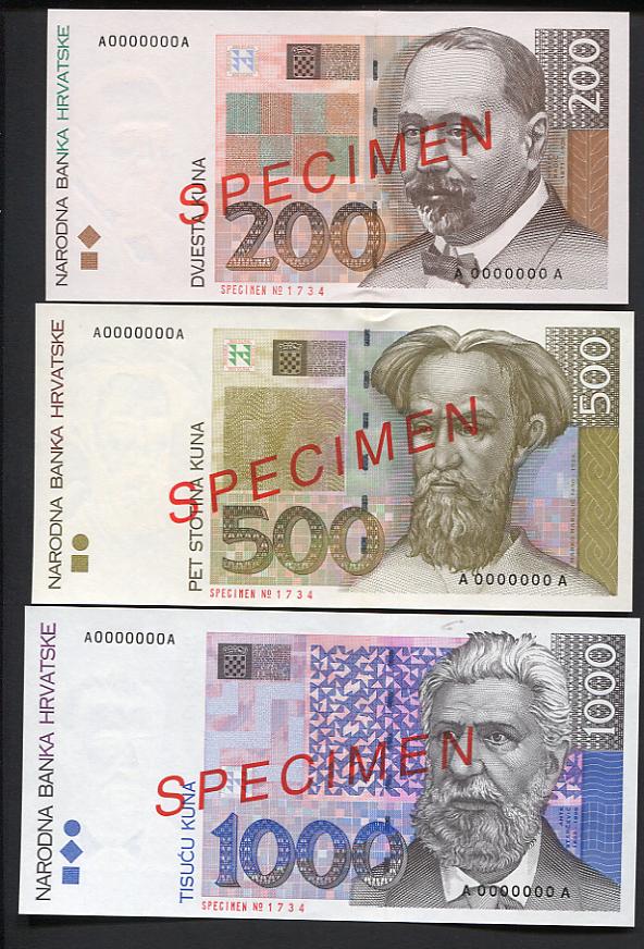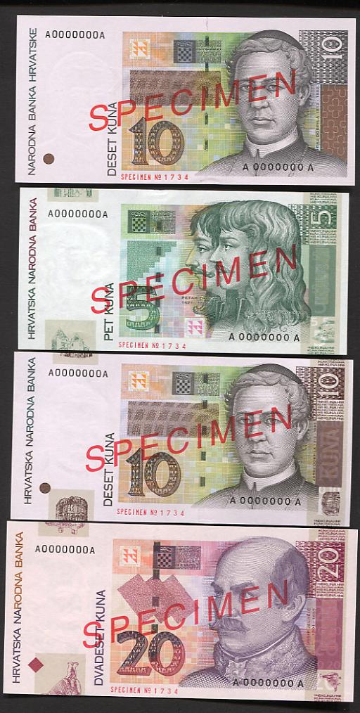 Kuna Ausgaben 1995 und 2001 als Specimen gedruckt von Giesecke und Devrient.