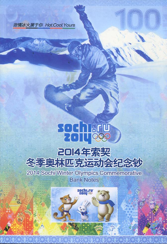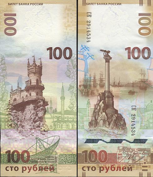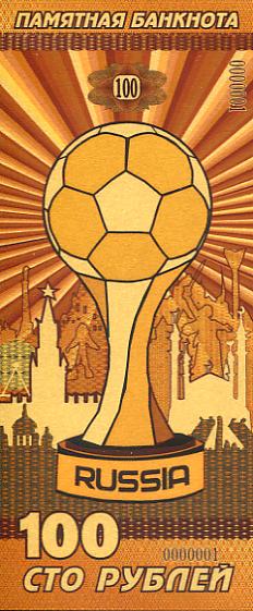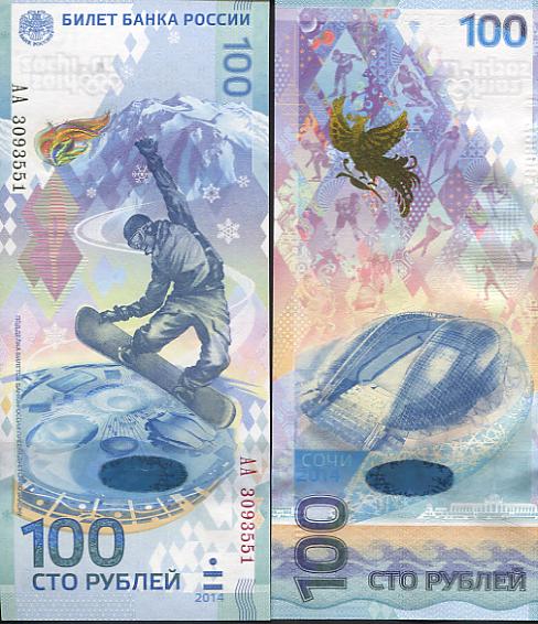 Sonderausgaben von Banknoten Bisher 2013 sowie 2015 und 2018 wurden 100-Rubel-Gedenknoten ausgegeben. Das Motiv von 2013 wurde anlässlich der Olympischen Winterspiele in Sotschi, in Umlauf gebracht. Die Vorderseite zeigt u. a. einen Snowboarder vor winterlichem Hintergrund sowie den zentralen Olympiapark in Sotschi. Auf der Rückseite ist neben Darstellungen verschiedener Wintersport-Disziplinen das Olympiastadion Sotschi abgebildet. Die Motive der Banknote von 2015, die in einer Auflage von 20 Millionen verbreitet wurde, sind, wie schon die 10-Rubel-Sondermünze von 2014, den jüngsten russischen Föderationssubjekten, der Republik Krim sowie der Stadt Sewastopol gewidmet. Ihre Vorderseite zeigt Darstellungen der „Krim-Eroberin“ Katharina der Großen, des Gemäldes „Das Russische Geschwader auf Reede vor Sewastopol“ von Iwan Aiwasowski, der Adler-Säule, die Rückseite mit dem „Schwalbennest“, dem Khanpalast von Bachtschyssaraj, dem Radioteleskops RT-70 in Jewpatorija und der Wladimirkathedrale, die der russische Admiral Michail Lasarew in Sewastopol bauen ließ, Bauwerke auf der Krim. Das Motiv der Banknote von 2018 ist der Fußball-Weltmeisterschaft 2018 in Russland gewidmet. Auf der Vorderseite ist ein Junge mit Fußball sowie der Torwart Lev Yashin, wie er nach einem Ball hechtet, abgebildet. Die Rückseite zeigt die stilisierte russische Flagge mit Silhouetten athletischer Fans und eine Karte der Russischen Föderation sowie die Namen der russischen Städte, die Playoff-Spiele veranstalten. (Jekaterinburg, Kaliningrad, Kasan, Moskau, Nischni Nowgorod, Rostow am Don, Samara, Sankt Petersburg, Saransk, Sotschi, Wolgograd).