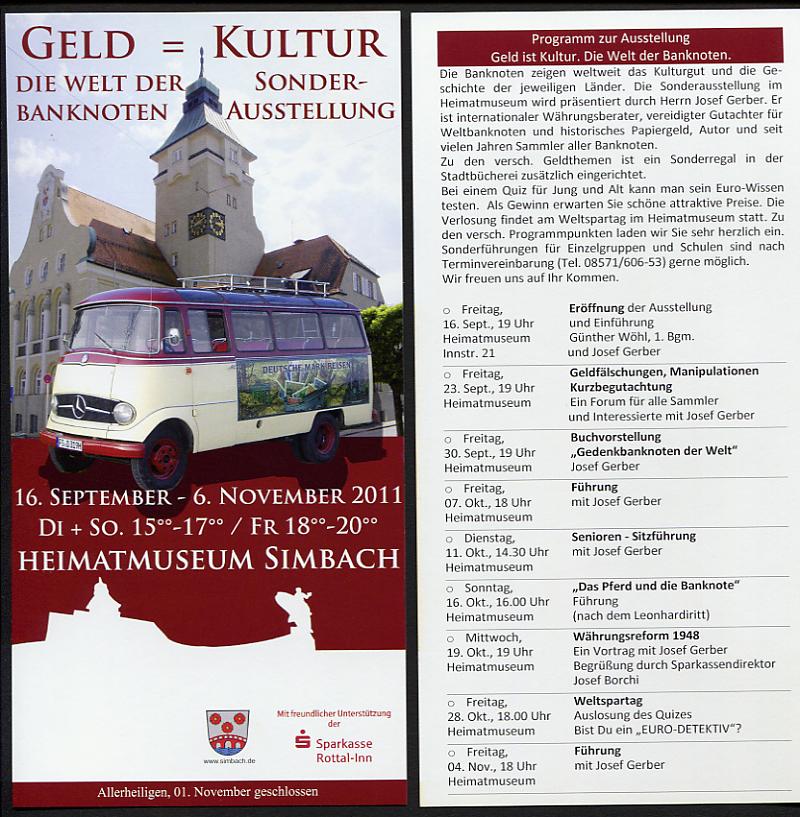 Wir haben auf der Startseite eine Ruprik Ausstellungen, dahinter verbergen sich viele Beispiele von Ausstellungen und von Referaten. Beides kann von meiner Person organisiert werden. Es gibt verschiedene Themen, als Ausstellung. Zum Beispiel: "Banknoten der Besonderen Art" - "Die Geschichte der deutschen Mark" - "Gedenkbanknoten" - "Geld Kunst" - "Notgeld der Regionen" - "Euro ?" -