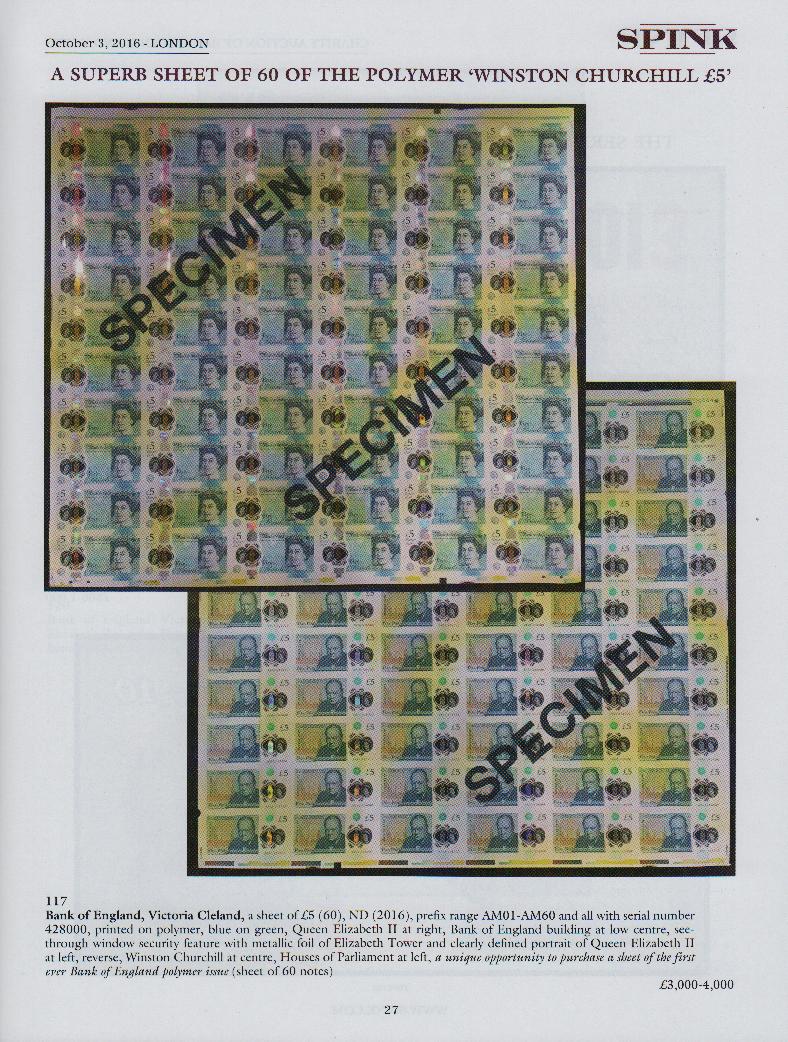 auch ein schönes Sammelgebiet. Die neue 5 Pounds Note 2016 wird als Charity bei Spink versteigert.