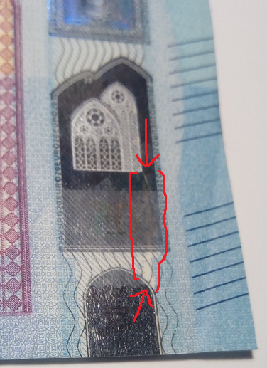 Ich habe eine 20€ Banknote die auf der Vorderseite im unteren Bereich des Silberstreifens, zwischen den unteren beiden Hologrammen eine Linie aufweist die aussieht als ob dort Farbe fehlt. Diese Linie zieht sich vom unteren Hologramm hoch bis unter das zweite Hologramm. (siehe Bild)