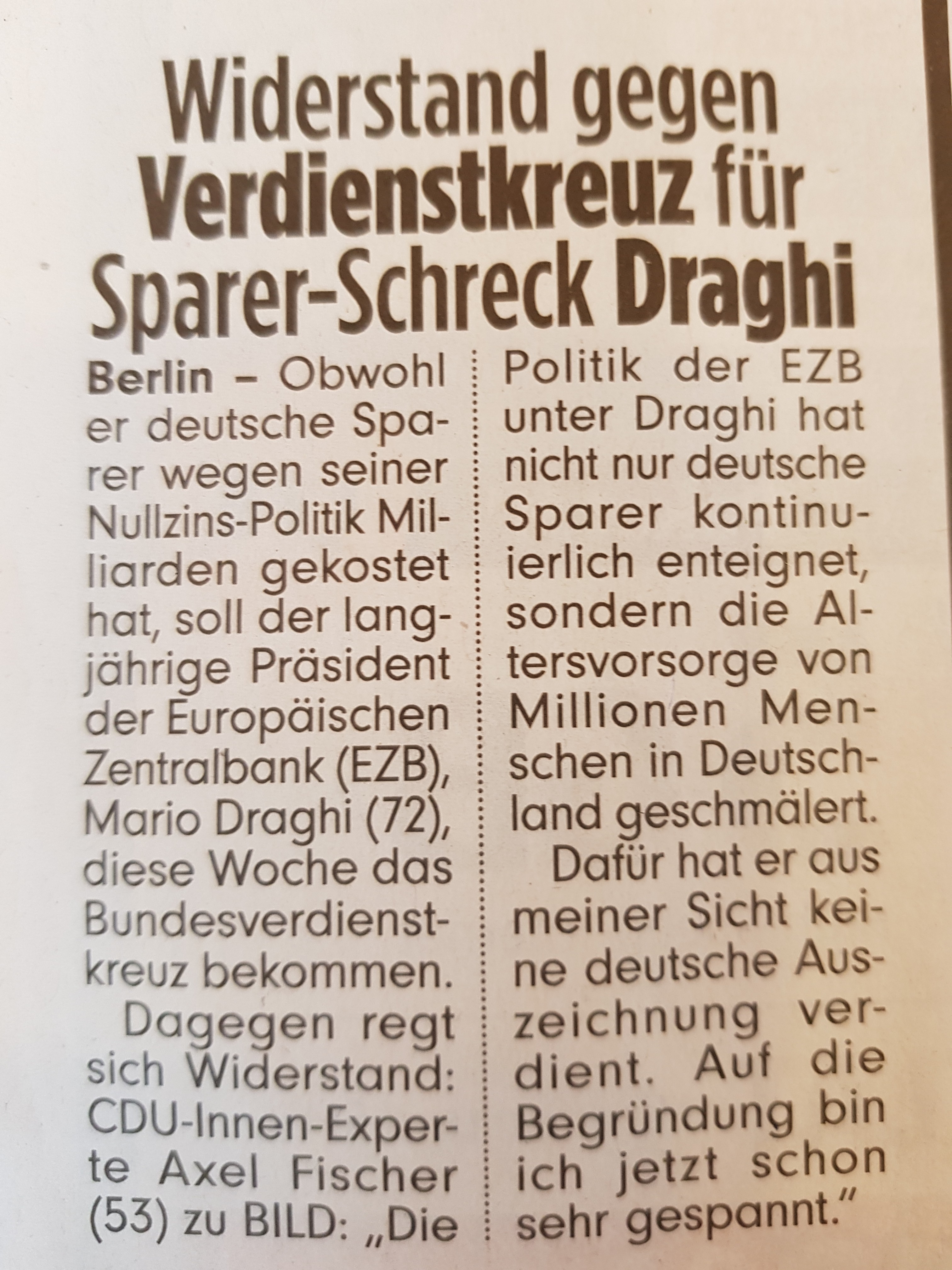 Draghi habe sich zwar zweifelsohne um Europa und die Stabilisierung der Eurozone verdient gemacht, aber der Preis, den die deutschen Sparer dafür zu zahlen hätten, sei groß.