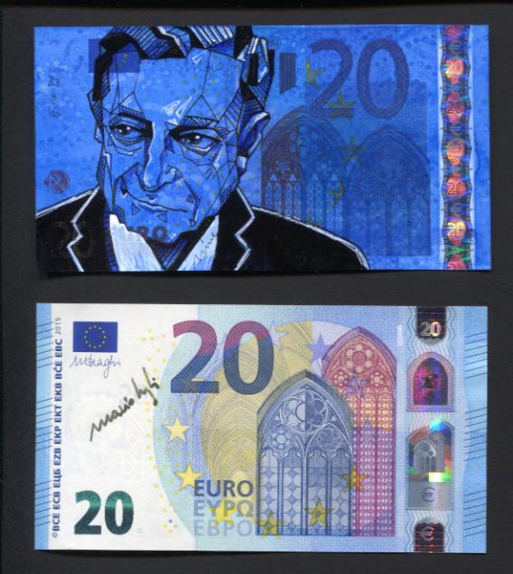 Handsignatur und GELD-KUNST schwarzer Rand hat Bedeutung, denn das Tun von Draghi wird in die Geschichte eingehen.