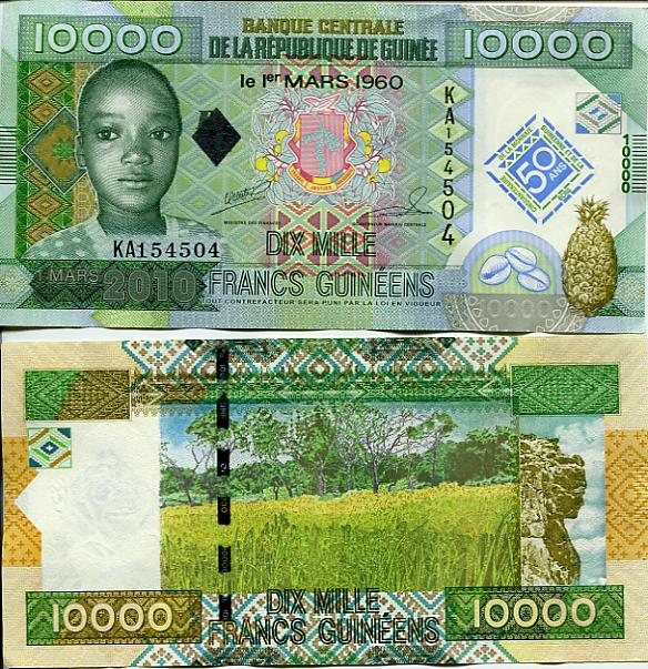 Zwei neue Banknoten 5 000 und 10 000 Francs Guinees 2010 als Gedenkbanknoten.