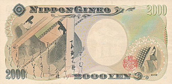 Auf der Vorderseite sieht man das Shureimon -Tor in Naha auf Okinawa. Auf der Rückseite Links, Szene aus dem Märchen vom Prinzen Genji ( 源氏物語 ), Rechts das Porträt von Murasaki Shikibu.