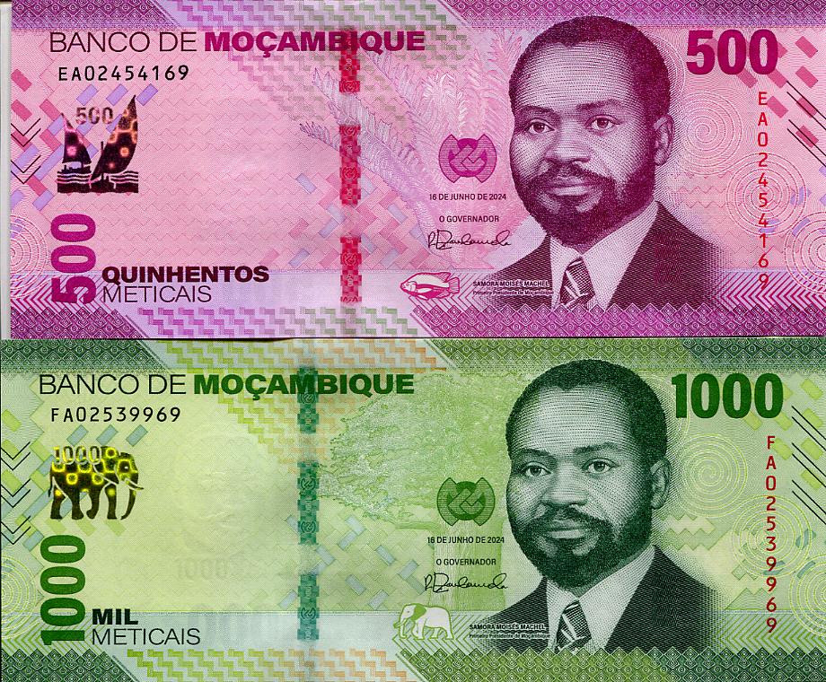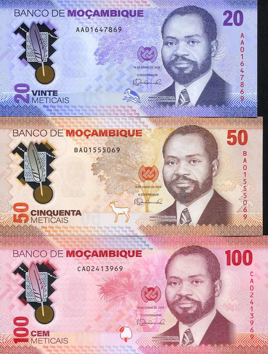 Es gibt in Mosambik einen Metical Day, das ist der 16. Juni und dieser Tag ist auch auf allen Banknoten vermerkt. So auch bei der neuen Ausgabe des Jahres 2024. Ab 16. Juni wurden die neuen Banknoten ausgegeben, es handelt sich bei den niedrigen 3 Werten um Polymergeld und die 3 höheren Werte in Papier.