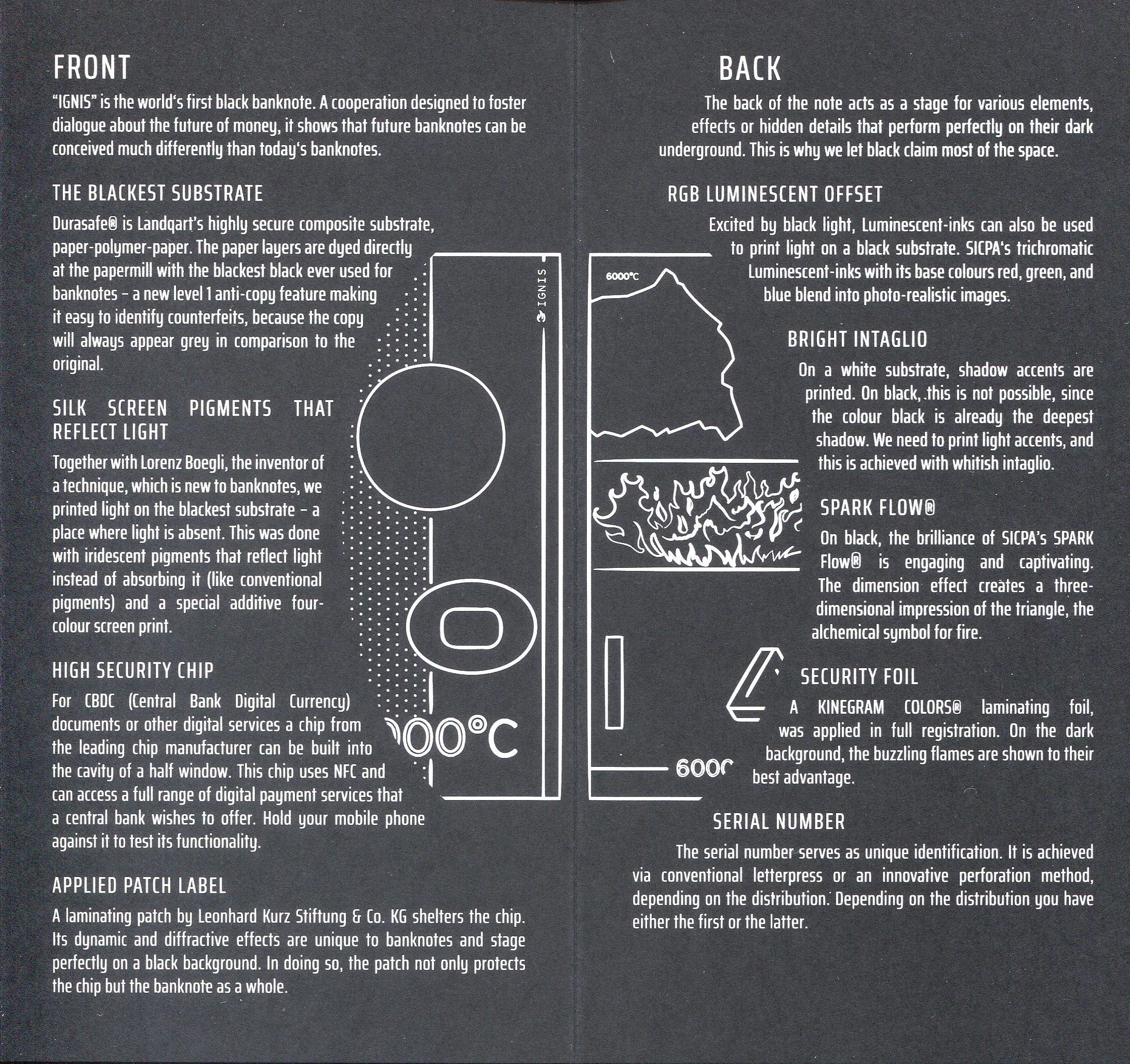 IGNIS ist die erste schwarze Banknote der Welt. Die Kooperation soll den Dialog über die Zukunft des Geldes fördern und zeigt, daß zukünftige Banknoten ganz anders konzipiert werden können als die heutigen.