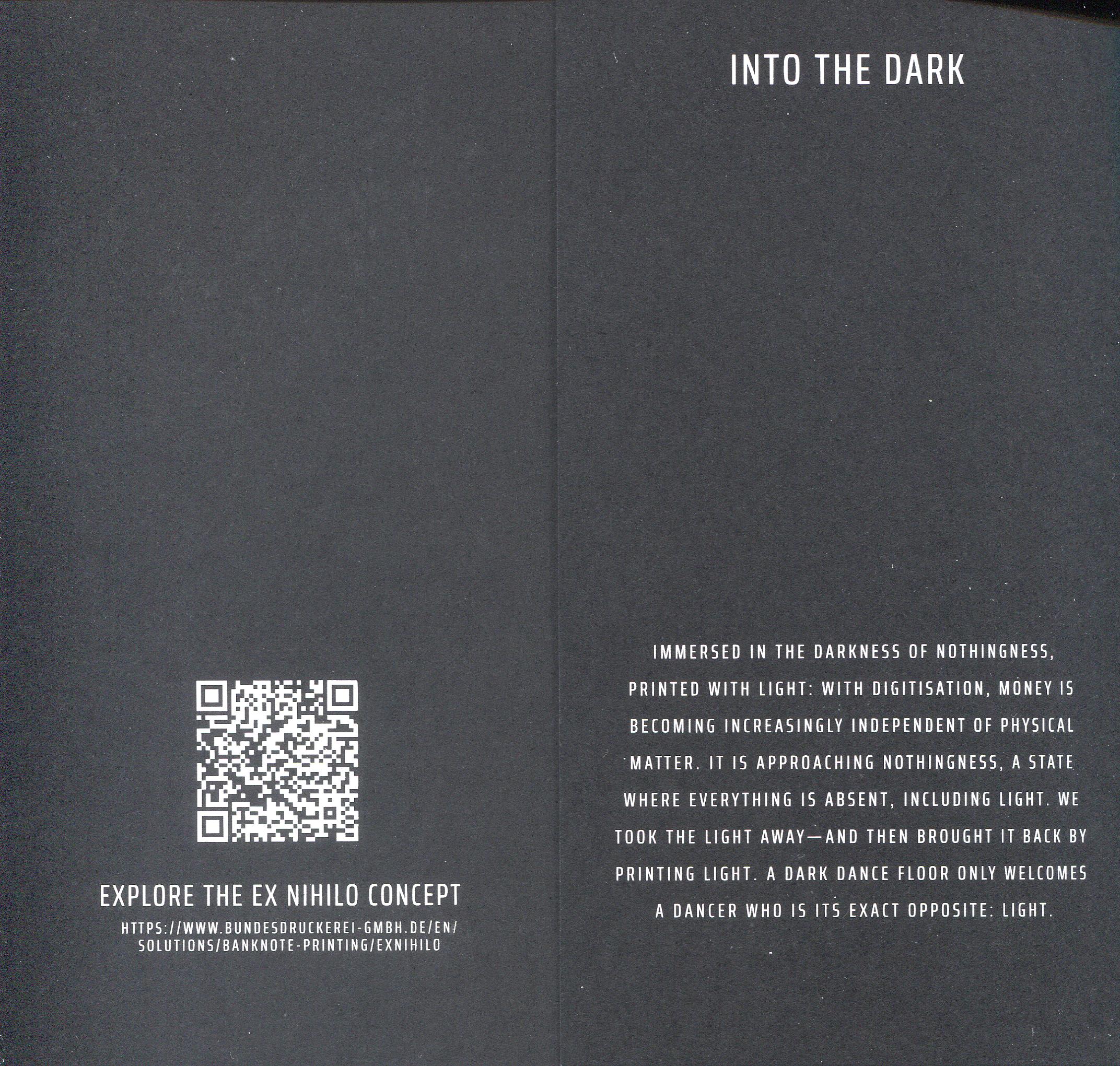Eingetaucht in die Dunkelheit des Nichts, gedruckt mit Licht. Mit der Digitalisierung wird Geld zunehmend unabhängig von physischer Materie. Es nähert sich dem Nichts, einem Zustand, in dem alles fehlt, auch Licht. Wir haben das Licht weggenommen - und es dann durch den Druck von Licht zurückgebracht. Eine dunkle Tanzfläche heißt nur einen Tänzer willkommen, der ihr genaues Gegenteil ist: Licht.