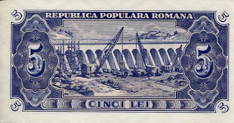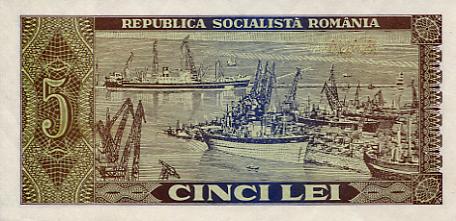Rumänien 5 Lei Rückseite LKW, Kräne und Bauwagen.