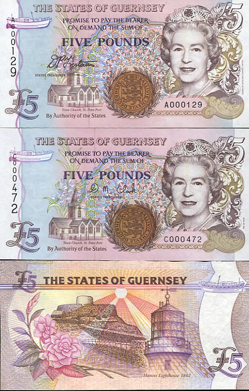 Guernsey 5 Pounds 1996 Vorderseite Twon Church, St. Peter Port und Rückseite Hanois Lighthouse 1862